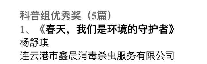 連云港市鑫晨消毒殺蟲服務(wù)有限公司楊舒琪《春天,我們是環(huán)境的守護者》獲得2021年“衛(wèi)康杯”征文賽科普組優(yōu)秀獎。